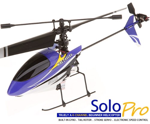 Don't want a Co-Axial Heli? Try this easy Solo Pro Fixed Pitch HelicopterAfter playing a Co-Axial Helicopter, you want something more serious? The Solo Pro is a very good choice. It has a Fixed Pitch one piece main rotor, easy to install, hard to break. The whole Heli body is very light weight, making it very durable in a crash, the simple mechanism also makes it great for beginners. The Solo Pro helicopter is truly a entry class 4-Channel helicopter. 4-Channel means the helicopter can receive 4 signals from your transmitterNine Eagle 260A Specifiction Overall Length - 200mm Main Rotor Diameter - 190mm All-up Weight - 28g with Battery included, amazing! Flight Time - Around 5 Mins. Recharge time around 30 Mins.Nine Eagle 260A Features: Ultra-micro size and weight perfect for indoor flying. Includes everything needed to fly-there's nothing extra to buy. 100% factory-assembled, test-flown and ready-to-fly right from the box. 4-channel transmitter equipped with 2.4GHz technology, digital trims and dual rates. Flight time more than 8 minutes. Recharge time 30 minutes. Charge directly on the transmitter Easy installation of battery Allow Mode1 to Mode2 only by antenna Item Include: 1 x Nine Eagles 260A Soar RC Helicopter 1 x 2.4GHz Transmitter 1 x 3.7V 120mAh Li-po Battery 1 x ScrewdriverAvailable Stores